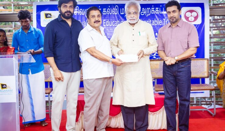 முன்னதாக, திரைக்கலைஞர் கார்த்தி வரவேற்று பேசியதாவது, “1979-ஆம் ஆண்டு, மே மாதம் தொடங்கப்பட்ட ‘சிவகுமார் கல்வி அறக்கட்டளை’தொடர்ந்து, பிளஸ் டூ தேர்வில் சிறந்த உயர்ந்த மதிப்பெண்கள் எடுத்த மாணவர்களை ஊக்கப்படுத்தி வருகிறது. 2005-இல் அகரம் ஃபவுண்டேஷன் தொடங்கப்பட்ட பிறகு ‘சிவகுமார் கல்வி அறக்கட்டளை’ பணிகளை அகரம் பொறுப்பேற்று நடத்தி வருகிறது. சிறந்த மதிப்பெண்கள் பெற்றவர்கள் என்பதை கடந்து, எந்த சூழலில் இருந்து படித்து வருகிறார்கள் என்பதை கண்டறிந்து, அவர்களில் வருடத்திற்கு 25 நபர்களுக்கு பரிசளித்து பாராட்டி வருகிறோம் என்றார்.