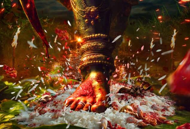 The title poster adds a mythological and rustic tone. It features a regal foot adorned with golden anklets and toe rings, stepping onto a large green leaf. On the leaf lies a traditional offering of cooked rice mixed with hen and goat heads, flowers, and sindoor, representing rituals and sacrifice. A blood-soaked sword heightens the drama, hinting at divine power and conflict. The title poster alone indicates the intense nature of the story.