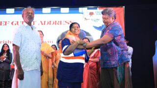 Radhakrishnan Parthiban invites sanitation worker Padma to Ethiraj College and honours her