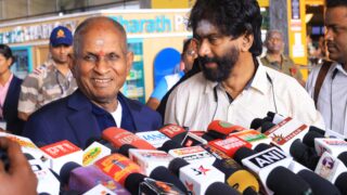 இசைஞானி இளையராஜா சிம்பொனி இசை நிகழ்ச்சிக்காக லண்டன் புறப்பட்டார்! புறப்படும் முன் சென்னை விமான நிலையத்தில் ஊடக நண்பர்களை சந்தித்தார்.